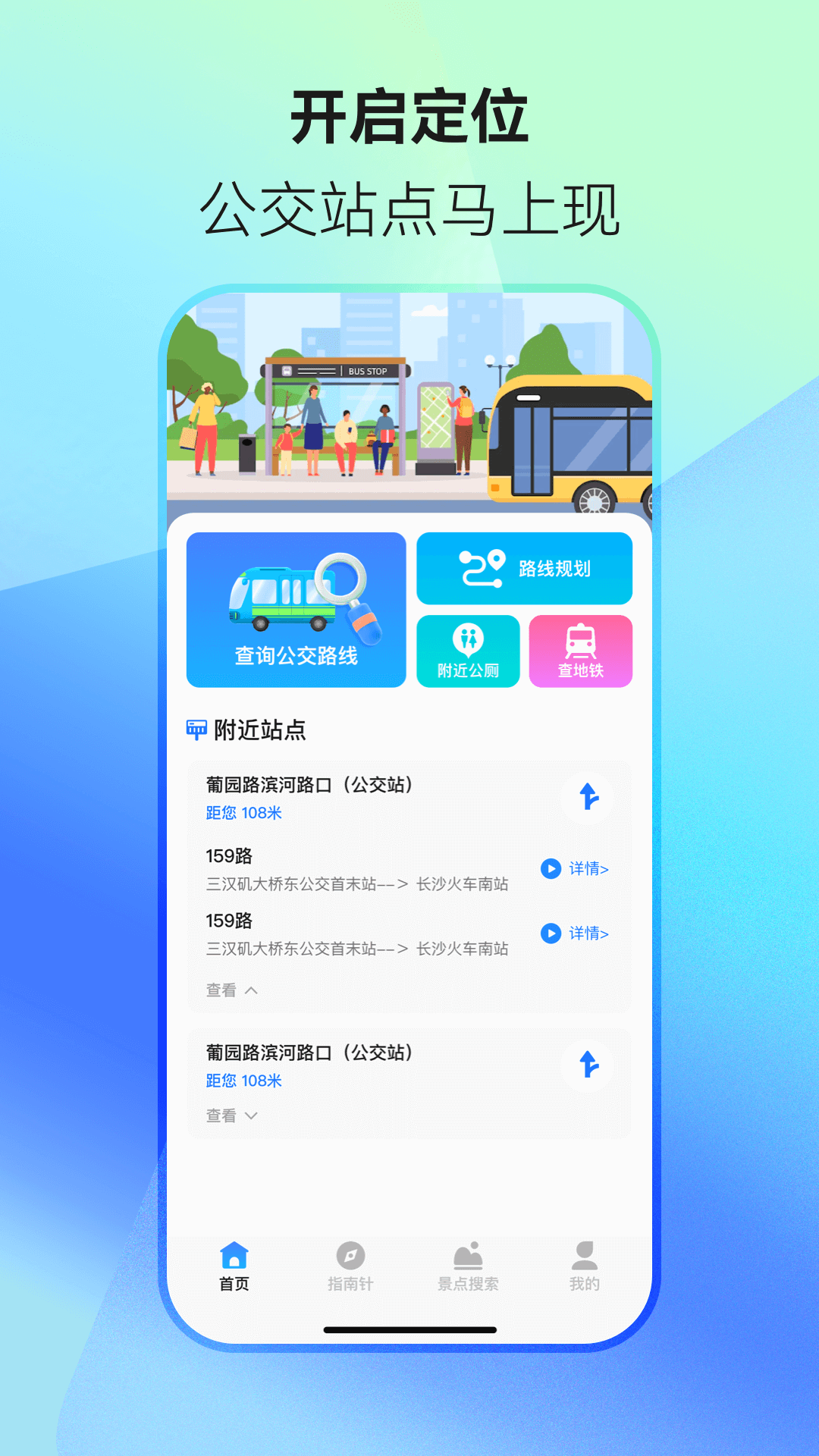 公交路线出行规划;路线规划,出行超Easy。跟着指南针,公交方向超好找。快来搜索,邂逅心仪好景点。开启定位,公交站点马上现。